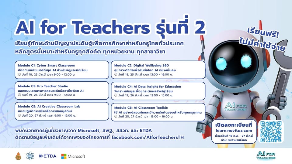 Microsoft ร่วมกับสำนักงานคณะกรรมการการศึกษาขั้นพื้นฐาน (สพฐ.) สถาบันส่งเสริมการสอนวิทยาศาสตร์และเทคโนโลยี (สสวท.) สำนักงานพัฒนาธุรกรรมทางอิเล็กทรอนิกส์ (สพธอ.) เปิดฝึกอบรมเพื่อเพิ่มทักษะ AI ออนไลน์สำหรับครูและผู้ที่สนใจ ฟรี! ไม่มีค่าใช้จ่าย พร้อมรับเกียรติบัตร
